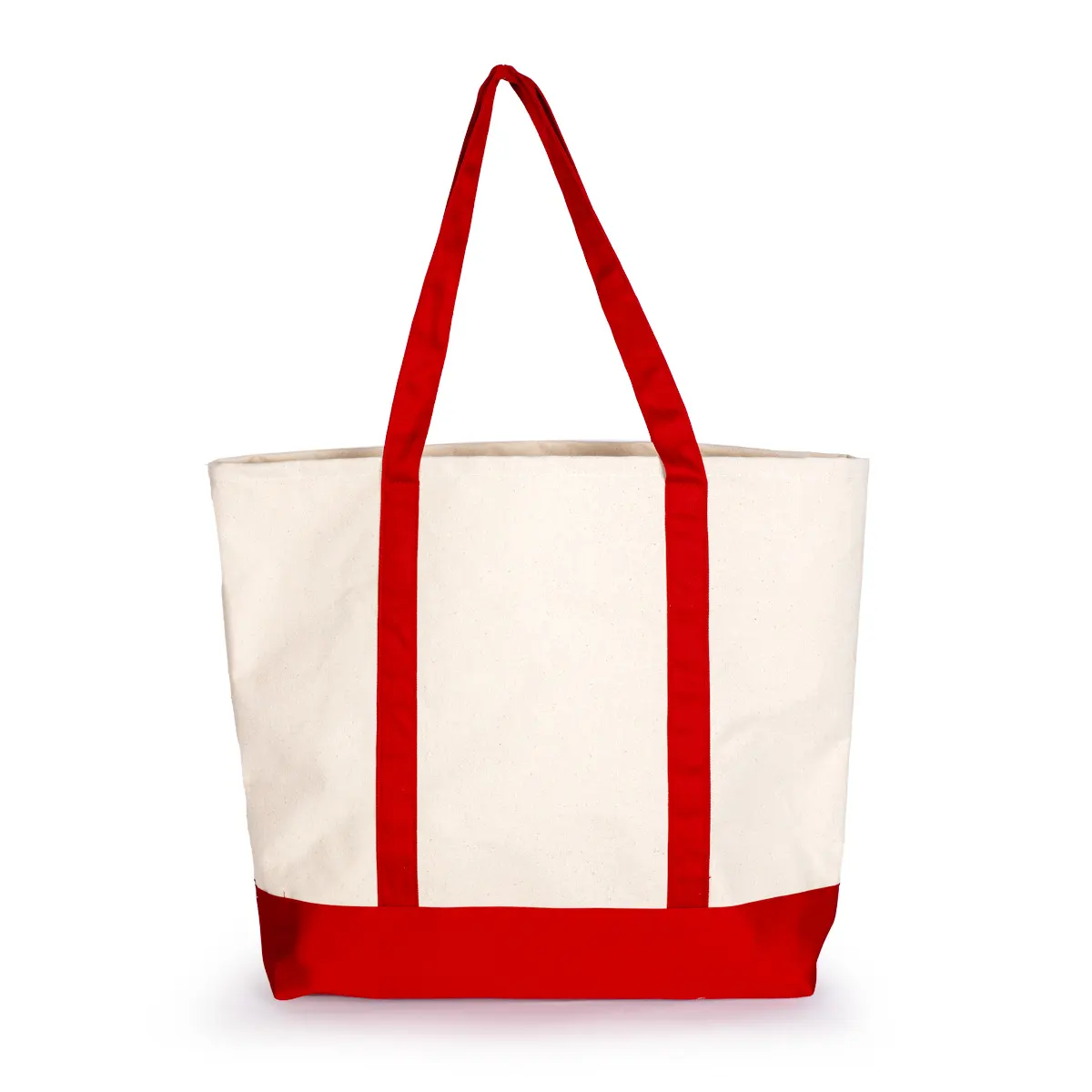 Made from sturdy natural canvas, this canvas tote bag is elevated with vibrant red accents for a standout look. With strong shoulder-length handles and a wide base, it offers both style and practicality. Perfect for brand customizations, retail use, or eco-friendly giveaways.